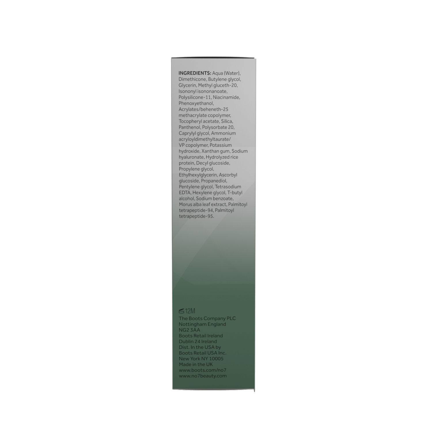 Aqua (Water), Dimethicone, Butylene glycol, Glycerin, Methyl gluceth-20, Isononyl isononanoate, Polysilicone-11, Niacinamide, Phenoxyethanol, Acrylates/beheneth-25 methacrylate copolymer, Tocopheryl acetate, Silica, Panthenol, Polysorbate 20, Caprylyl glycol, Ammonium acryloyldimethyltaurate/VP copolymer, Potassium hydroxide, Xanthan gum, Sodium hyaluronate, Hydrolyzed rice protein, Decyl glucoside, Propylene glycol, Ethylhexylglycerin, Ascorbyl glucoside, Propanediol, Pentylene glycol, Tetrasodium EDTA, Hexylene glycol, T-butyl alcohol, Sodium benzoate, Morus alba leaf extract, Palmitoyl tetrapeptide-94, Palmitoyl tetrapeptide-95.
